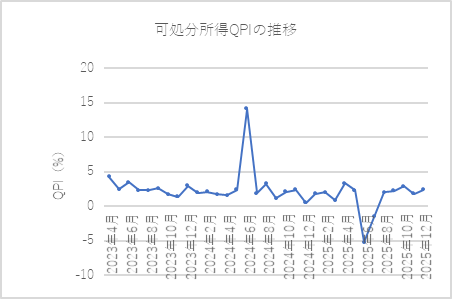 2025年12月度の可処分所得QPIは+2.41%となり、大幅に悪化した前月の+1.84%から0.57ポイント改善した。これにより、前月に一時中断した回復トレンドが再び上向く兆しを見せている。しかし、直近の物価上昇率が3%前後で推移している状況を鑑みると、可処分所得の伸び(+2.41%)は依然として不十分であり、家計の実質的な購買力は依然として抑制された状態にあると言える。